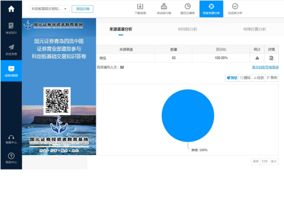 国元证券投教基地与营业部结合宣传网盘相关资源,制作宣传材料,开展面向不同投资者群体的投教知识宣传,通过网上答卷的方式引导投资者学习,了解相关知识。活动参与投资者52人,取得非常好的效果。