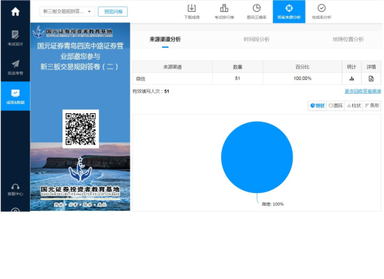 国元证券投教基地与营业部结合宣传网盘相关资源,制作宣传材料,开展面向不同投资者群体的投教知识宣传,通过网上答卷的方式引导投资者学习,了解相关知识。活动参与投资者51人,取得非常好的效果。